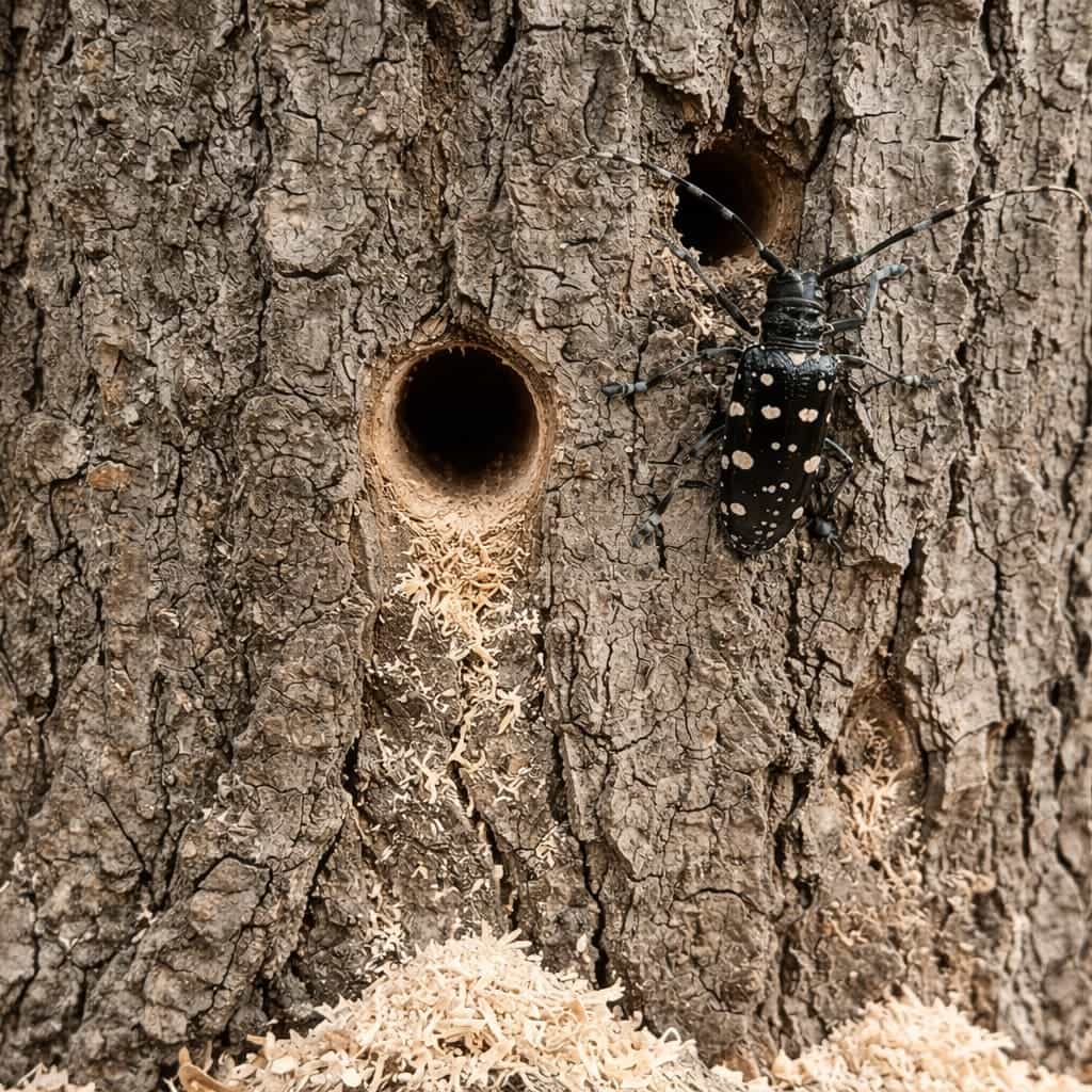 • Small holes or sawdust-like material around the trunk